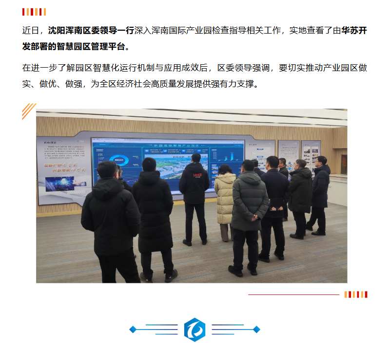 近日,沈陽(yáng)渾南區(qū)委領(lǐng)導(dǎo)一行深入渾南國(guó)際產(chǎn)業(yè)園檢查指導(dǎo)相關(guān)工作,實(shí)地查看了由華蘇開(kāi)發(fā)部署的智慧園區(qū)管理平臺(tái)。
